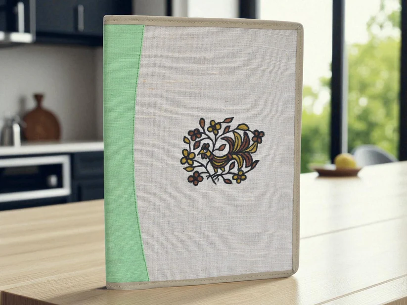 This jute folder features authentic Sohrai painting, blending traditional artistry with practical design. Ideal for meetings and office use, it offers a durable, eco-friendly solution to organize documents while showcasing unique cultural craftsmanship. Its natural texture and vibrant hand-painted motifs make it a sophisticated accessory for professionals seeking both functionality and style.